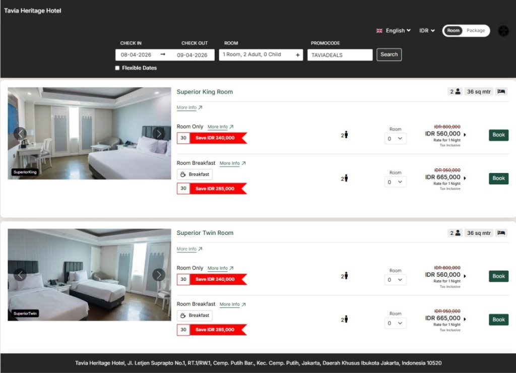 Promo ini berlaku khusus untuk reservasi melalui website resmi hotel di www.thetaviaheritagehotel.com. Dengan menggunakan kode voucher TAVIADEALS, tamu dapat menikmati harga yang lebih hemat tanpa mengurangi kualitas layanan dan kenyamanan yang ditawarkan.